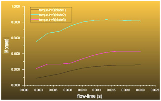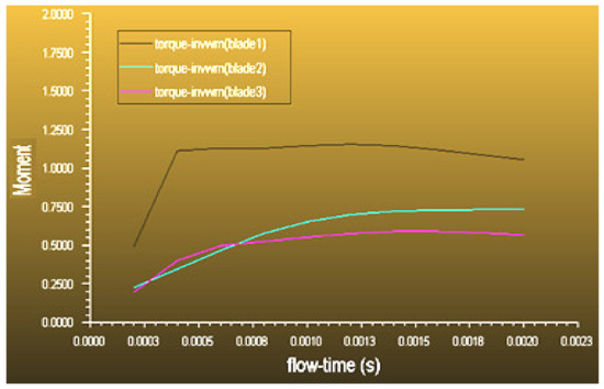 Figure 18b exhibits the velocity gradients from inlet to outlet of the turbine model. A velocity gradient is a measure of velocity variations that happened between inlet and outlet for the involute case. Further, involute turbines generate only positive moments from all three blades; consequently, this increases the resultant torque, as shown in Figure 19. The moment generated by the involute blade is 6.82 times higher than the C-blade rotor.