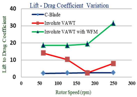 For Case 3, the minimum lift to drag ratio is 18.44 obtained at 60 rpm, and it increases to the highest value of 31.44 at 250 rpm (Figure 25). Hence, the addition of WFM effectively improves the aerodynamic forces of the wind turbine; therefore, WFM-based wind turbines would be a great choice for all kinds of wind velocity if the WFM could be turned in the direction of wind flow. The numerical data of all three configurations are given in Table 5.