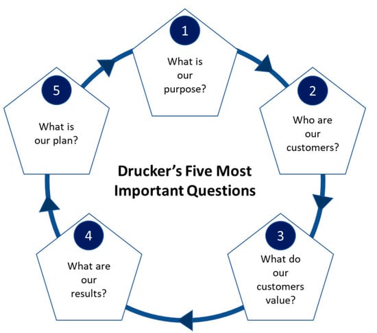 - Understand the Five Most Important Questions to Ask about Your Business. Drucker School Business Performance Basics. Personal communication from Vijay Sathe, a Colleague of Peter Drucker and Chaired Professor at the Drucker School of Management, Claremont Graduate University. Available online: https://trailhead.salesforce.com/en/content/learn/modules/drucker_five_most_import_questions/drucker_five_five_most_import (accessed on 20 September 2020).