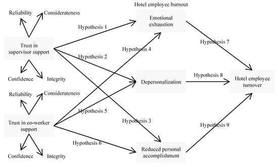 Although trust in support has been researched in prior studies, its influence on hotel employee turnover decision formation has been rarely unearthed in the extant hospitality and tourism literature. In addition, little research has examined the combined role of trust in supervisor support and trust in co-worker support at the workplace in minimizing emotional exhaustion, depersonalization, and reduced personal accomplishment among employees. Moreover, even if the hotel management provides a valuable platform, hotel employees still experience inadequate development opportunities, low salaries, excessive workloads and unsocial working hours [8,13,17]. When the demands of the job remain unfulfilled, the phenomenon of burnout will occur [13,17]. Additionally, due to the characteristics of hotel services where encounters between employees and guests are common, hotel staff suffers higher burnout rates as compared to other sectors [5,8,13]. Nevertheless, the hotel literature has not brought the concept of burnout and its constituents into the framework bridging the association between trust-in-support factors and employee turnover.