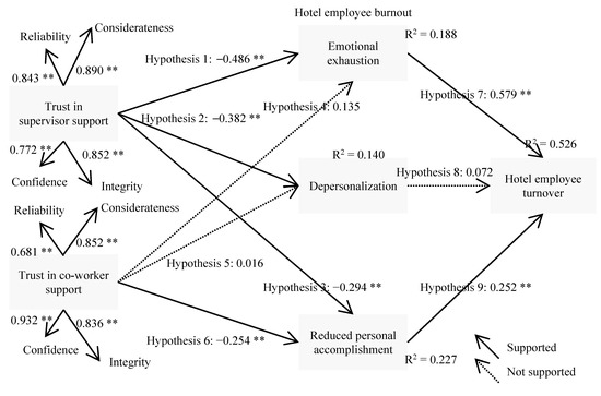 The hypothesized effect of trust in supervisor support on hotel employee burnout factors was tested. As expected, trust in supervisor support exerted a significant and negative influence on emotional exhaustion (β = −0.486, p < 0.01), depersonalization (β = −0.382, p < 0.01), and reduced personal accomplishment (β = −0.294, p < 0.01). This result supported Hypotheses 1, 2, and 3. The hypothesized effect of trust in co-worker support on burnout factors was tested. Our result showed that trust in co-worker support has a significant and negative impact on reduced personal accomplishment (β = −0.254, p < 0.01). However, its impact on emotional exhaustion (β = 0.135, p > 0.05) and depersonalization (β = 0.016, p > 0.05) was not significant. Therefore, while Hypothesis 6 was supported, Hypotheses 4 and 5 were not supported. Next, the proposed influence of burnout dimensions on turnover was assessed. The findings revealed that both emotional exhaustion (β = 0.579, p < 0.01) and reduced personal accomplishment (β = 0.252, p < 0.01) exerted a significant effect on hotel employee turnover. Yet, the impact of depersonalization on turnover was not significant (β = 0.072, p > 0.05). Accordingly, Hypotheses 7 and 9 were supported whereas Hypothesis 8 was not supported.
