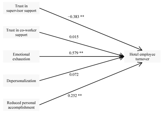 An indirect effect of research variables was assessed. Table 3 includes the details about indirect associations among study constructs. Our result showed that trust in supervisor support significantly affected hotel employee turnover indirectly through employee burnout factors (β = −0.383, p < 0.01). However, the indirect influence of trust in co-worker support on turnover was not significant (β = 0.015, p > 0.01). This result indicated that hotel employee burnout factors, namely emotional exhaustion, depersonalization, and reduced personal accomplishment played a significant mediation role in the trust-in-support factors and turnover. The total impact of research constructs was examined. As shown in Table 3, emotional exhaustion has the greatest total effect on turnover (β = 0.579, p < 0.01), followed by trust in supervisor support (β = −0.383, p < 0.01), reduced personal accomplishment (β = 0.252, p < 0.01), depersonalization (β = 0.072, p > 0.05), and trust in co-worker support (β = 0.015, p > 0.05).