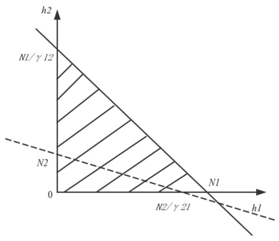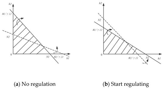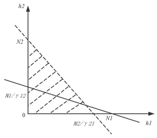 In the analysis process of the above game model, it can be concluded that there is a certain relationship between government monitoring and the development of green intelligent ports. We can use the Lotka–Volterra model to further analyze the relationship between the two sides. The Lotka–Volterra model was originally developed from the logistic model of population ecology. The purpose of the Lotka–Volterra model is to study the competitive and cooperative relationship between different populations in the ecosystem; that is, the relationship between different populations and within different populations in the limited resource environment. Since then, the model has been applied to more industrial fields to study innovation diffusion, evolution, and competition.