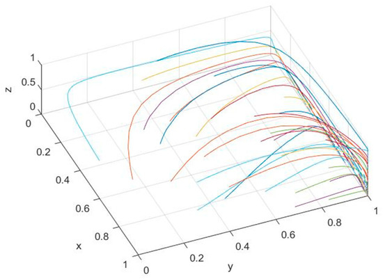 According to the constraints of the evolutionary stability parameters at this point, the parameter values are set to λ1 = 1300, λ2 = 2800, e = 350, m3 = 250, cg = 120, m1 = 600, b = 450, p = 520, zg = 5000, sg1 = 2500, sg2 = 1000, cf = 700, sf = 200, m2 = 60, and r = 40. As shown in Figure 6 all random initial probability points eventually converge to (1, 1, 1), but the curve also has an “inflection point”. From the figure, we can find that part of the curve initially extends in the direction where x is 0. Some curves have larger inflection points. As the initial probability of z continues to increase, the x inflection point becomes smaller and eventually tends to a stable point. At this point, the evaluation probability of the third-party organization has a greater impact on the port.