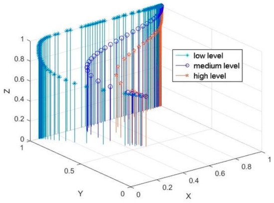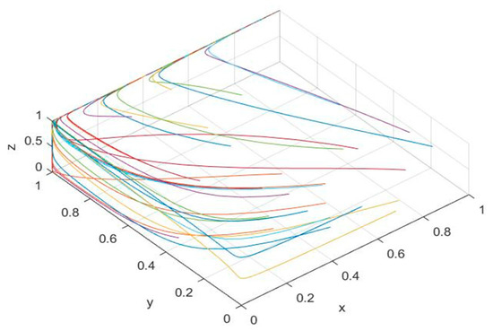 According to the constraint conditions of evolutionary stability parameters at this point, the parameter values were set to λ1 = 2200, λ2 = 2800, e = 450, m3 = 150, cg = 120, m1 = 600, b = 750, p = 762, zg = 5000, sg1 = 1800, sg2 = 1000, cf = 700, sf = 200, m2 = 60, and r = 40. As shown in Figure 5, all random initial probability points eventually converged to (1, 0, 1). When the initial probability is low, as shown in the curve, the probability of y will first tend to 1, then trend toward evolutionary stability. The trend decreases as the initial probability of x or z increases.