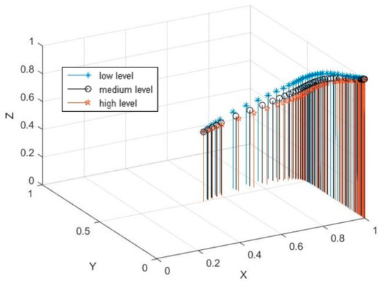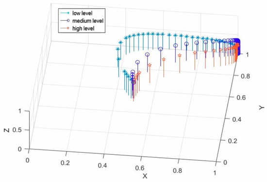 The parameter constraints indicate that the port strategy selection under the stable point B6(1, 0, 1) is mainly affected by m3 + e. Therefore, let m3 + e take three sets of values of low, medium, and high levels, respectively, and their values represent the quantitative impact of the evaluation results of third-party organizations on the port, and then how they affect the rate of system evolutionary stability can be analyzed. As shown in Figure 8, m3 and e respectively take the values (150, 450), (350, 750), (750, 1050), and the initial probabilities of the three sides take the same value as 0.5. After multiple games, they finally converge to (1, 0, 1) state. When the value of m3 + e is low, the evolution rate reaches its slowest level, and when the value is high, the evolution rate reaches its fastest level. However, it can be seen from the figure that under different value levels, there is little difference in the rate of evolutionary equilibrium. This indicates that in the steady state, the third-party organization plays a positive role in the evolutionary stability of the three sides. However, compared with the above figure, it can be found that its effect on evolutionary stability is not as great as that of the government’s macro-control efforts. The impact of the evaluation results on the port is not considerable enough. This also confirms the current status of Chinese evaluation of green intelligent ports; the influence of the government is large, while the influence of third-party organizations needs to be strengthened.