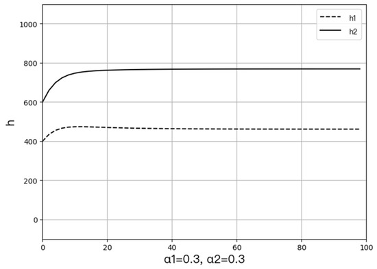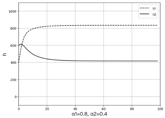 In the initial stage, we set γ12 = 0.7 and γ21 = 0.5, which means that the basic port suppression coefficient is greater than the coefficient for the port that increases the construction of a green intelligent port. α1 = α2 = 0.3, which means that the government subsidy coefficient is the same as the penalty coefficient. The operation result is shown in Figure 10. In this state, most of the ports are in the primary transformation stage, and the government has not strengthened its regulations and control. The two types of ports are in a normal spreading state and gradually flatten as the number of simulations increases.