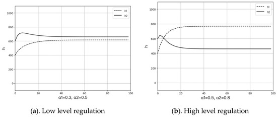 As the government gradually increases subsidies and penalties, the inflection point of diffusion begins to appear on the market. As shown in Figure 11a,b, the two figures are set as α1 = 0.3, α2 = 0.5, and α1 = 0.5, α2 = 0.8. We can see that with the strengthening of government regulation and the increase in the number of evolutions, the number of ports that increase the construction of green intelligent ports gradually increases, and it begins to surpass the number of standard ports over time. Zhang found that increasing punishments is one of the ways for a government to maintain a good evaluation level, and it is also one of the methods that can be used to ensure the positive transformation of the game [8,16,30,48]. In the early stages of evolution, if the transformation cost of enterprises is high, then the government must increase subsidies or increase penalties to ensure the survival of enterprises in transition [41,49].