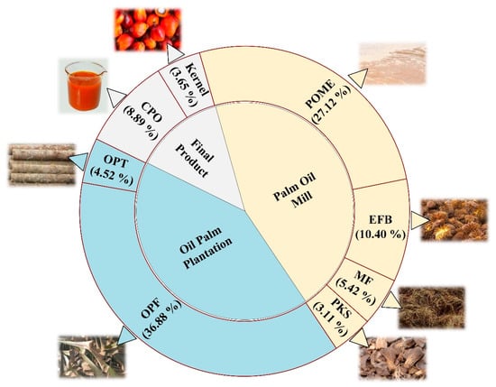 Conversely, the palm oil industry has raised some environmental issues, such as deforestation and waste generation. The first issue has particularly caused the backlash by the European countries, which started refusing the palm oil products despite being one of the largest consumers of CPO. Concurrently, the effort of phasing out the palm oil can be disadvantageous given its benefits as stated above. Thus, to minimize the impact of deforestation, Roundtable on Sustainable Palm Oil (RSPO) emerged as a global organization that encourages the sustainable source of palm oil by certifying the supply chain model. Similar certification bodies, such as Indonesian Sustainable Palm Oil (ISPO) and Malaysian Sustainable Palm Oil (MSPO), were also made mandatory to the local palm oil industries to ensure sustainable practices on a national scale [7,8]. Besides, the Malaysian government also announced a policy to limit the plantation area at 6.5 Mha by 2023 as an effort to halt deforestation [9]. On the other hand, the palm oil industry may also cause environmental pollutions if not treated properly. In particular, every ton of CPO can be associated with 9 tons of biomass, which translates to roughly 179 Mt of biomass in Malaysia as of 2019 [10]. Additionally, the palm oil industry has contributed up to 77% of the total agricultural wastes in Peninsular Malaysia [11]. This includes oil palm frond (OPF) and oil palm trunk (OPF) from the oil palm plantation, and subsequently empty fruit bunches (EFB), mesocarp fiber (MF), palm kernel shell (PKS), and palm oil mill effluent (POME) from the palm oil mill. The composition of the oil palm biomass is illustrated in Figure 1.