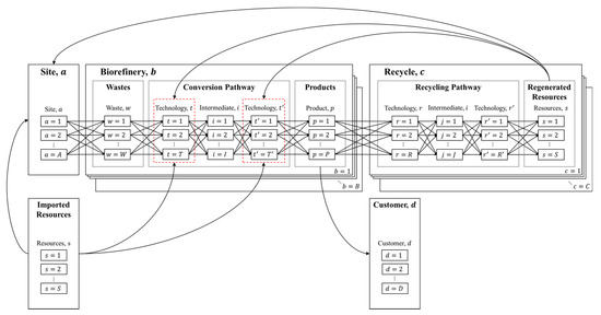 The formal description of the model is given as follows. A set of waste is generated in sites and collected by biorefinery . These wastes are then processed using a series of technologies and to generate the final products with the involvement of intermediates . Next, there are two possible outcomes of the final products . It can be either exported to customers to generate income for the industry. Or, it can be transferred to recycle for further processing via a series of technologies and with the involvement of intermediates . The outcome of the recycle is the regenerated resources , which are then consumed in sites , technologies and to sustain the operation. Alternatively, the resources can also be imported from external suppliers. To note, the regenerated resources is assumed to be compatible and replaceable with the corresponding imported resources. A superstructure of the model is illustrated in Figure 2.