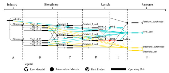 Rank 1 solution structure of the base case model (note: A- generation of biomass; B- biomass conversion technology; C- decision-making on biomass-derived product; D- generation of medium pressure steam (MPS) and high pressure steam (HPS) for recycling; E- generation of electricity for recycling; F- management of resource).