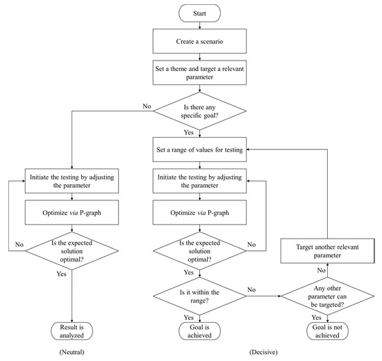 After the maximal structure of the biomass network is modeled and optimized using P-graph, sensitivity analysis is performed to observe the changes in decision-making under sections B, C, and D. The analysis is initiated by creating a scenario, whereby an expected solution is predetermined based on the theme of the scenario. Often these expected solutions can be found in the list of suboptimal solutions generated by the SSG algorithm. Next, a range of numerical values is given to one (or multiple) targeted parameter that is relevant to the theme. After that, the targeted parameter(s) are adjusted at a set increment or decrement depending on the starting value, followed by the P-graph optimization to obtain the updated result. The process is then repeated to observe the change in the ranking of the expected solution.