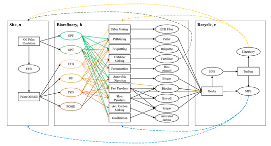 Apart from that, a biomass supply chain case study can be investigated by considering the actual location of the sites, while implementing the concept of the sustainable circular economy. This will inevitably increase the scope of optimization, such as the number and location of biorefineries [64], distribution route of the materials, and transportation costs, which shall provide a more practical result to aid the decision-making [65]. Moreover, the palm oil industry can be integrated with other industry sectors, such as energy, transportation, chemical, or different agriculture industry, to extend the value and supply chain of the biomass. As more entities are involved in the network, wastes of greater variety and amount can be collected for processing and recycling. At the same time, more consumers can be identified to encourage the absorption of wastes as resources and the development of conversion technologies. From there, a wider circularity can be formed between multiple industries by exchanging the waste materials and regenerated resources, which leads to the industrial symbiosis and provides a step forward in achieving the waste-to-wealth concept [66].