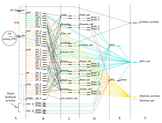 Maximal structure of the base case study in P-graph framework. The technologies in section B are abbreviated as follows: Pel—Pelletizing; Bri—Briquetting; Ferm—Fermentation; AD—Anaerobic Digestion; FP—Fast Pyrolysis; SP—Slow Pyrolysis; Gas—Gasification; Fib—Fiber Making; Fert—Fertilizer Making; AC—Activated Carbon Making. The scaling node ‘Scaling_FFB’ is circled in (a) (note: A- generation of biomass; B- biomass conversion technology; C- decision-making on biomass-derived product; D- generation of medium pressure steam (MPS) and high pressure steam (HPS) for recycling; E- generation of electricity for recycling; F- management of resource).
