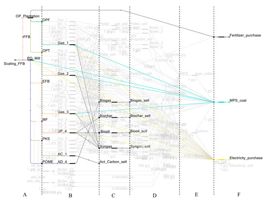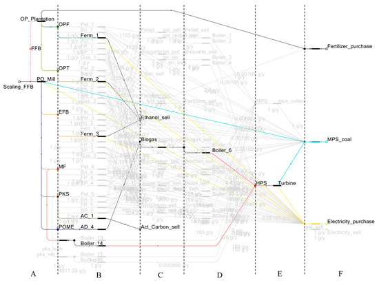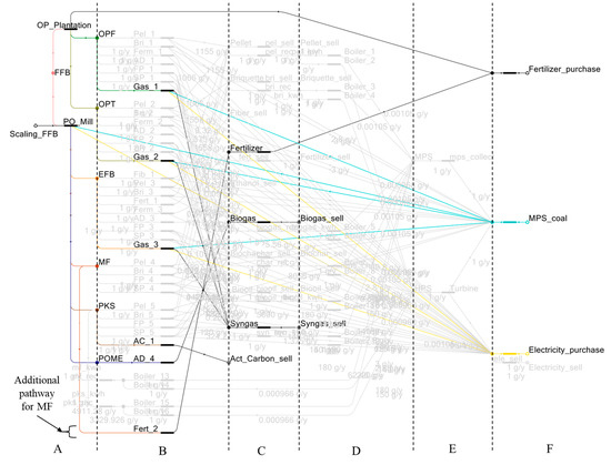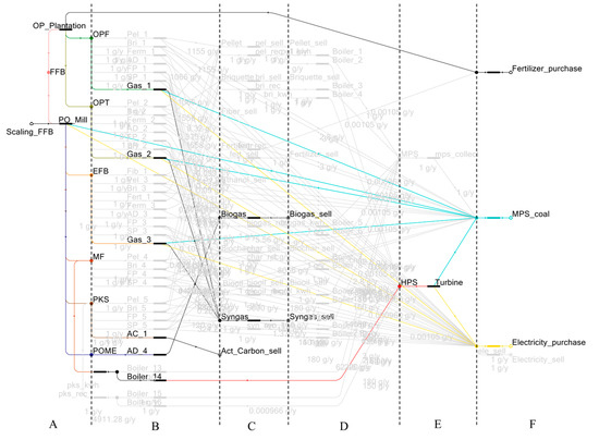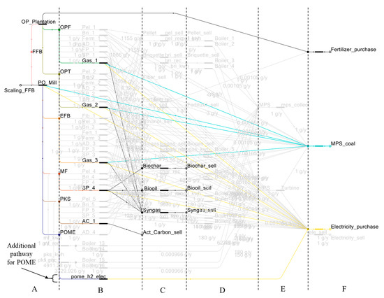 The expected solution structure that favors the new pathway for POME. The pathway for other biomass remains the same as in the benchmark solution (note: A- generation of biomass; B- biomass conversion technology; C- decision-making on biomass-derived product; D- generation of medium pressure steam (MPS) and high pressure steam (HPS) for recycling; E- generation of electricity for recycling; F- management of resource).