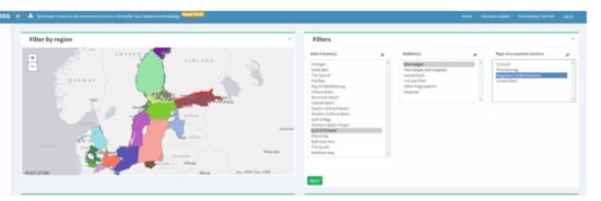 For the consultation, three filters can be specified: the geographic basin of interest (one or multiple) in the Baltic Sea based on HELCOM divisions; ecosystem and type of ecosystem service of interest.