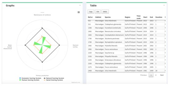 As an example, in Figure 2 the Gulf of Finland is selected as a study basin (selected study region borders become dark red), and information about the regulation & maintenance of ecosystem services of macroalgae has been sought. Three filters—basins (s), habitat (s), and ecosystem services, in any desired combination, allow the user to filter data across various ecosystems and coastal regions of the Baltic Sea.