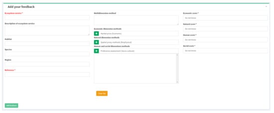 - Specify the knowledge about the ecosystem service in the interactive form (e.g., ecosystem service, habitat, species, region).