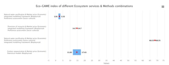 An example of the Eco–GAME index (mean and standard deviation) for different combinations of ecosystem services and study methods.