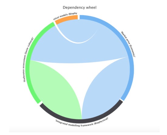 In this way, the end-users of the portal would be informed about the strength of linkages between different methodologies when assessing performances related to the UN SDGs. Figure 7 (dependency wheel) gives an example of a graphical output which assesses the strength of linkages among different methods with higher linkages suggesting better synergies among methods to deliver information on various ecosystem services.