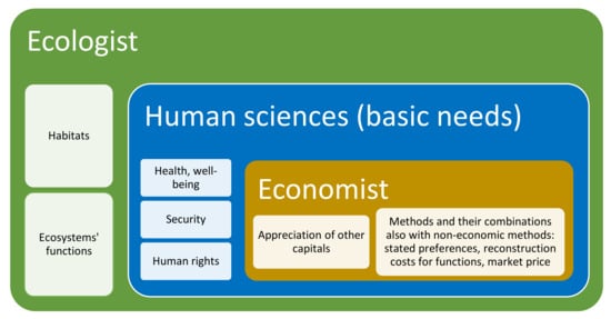 According to this view economic valuation should complement the ecological assessment and be added on top of that. This would mean that once the ecosystem functions have been physically and ecologically assessed (Natural capital), and once human basic needs and well-being would have been assured (Human capital), then, valuation methods would allow in supporting choices on the side of societal aims (Social capital). However, even if this view is theoretically valid, this does not happen in practice. Valuation methods are sometimes used to support decision-making without applying suitable methods for estimating possible changes in other value dimensions. In this case, specific choices might jeopardize Natural or Human capital equilibrium. It is common that different assessments are not integrated in practice, nor do they take into account the respective outcomes. As an example, the communication of a price for a fish species does not include the total maximum amount that is possible to catch, without putting at risk the species itself.