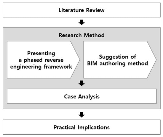 The research method for creating sustainable cultural heritage archives based on literature review is shown in Figure 1. First, a phased reverse engineering framework was presented. For this, point cloud data (PCD) must be acquired through laser scanning, and standards for building BIM data that can be used in the long term by comparing and analyzing this data with existing archives must be established. Second, from the perspective of the subject of use of cultural heritage archives, the BIM authoring method, that is easy to access and uses BIM data, was suggested. As seen in previous studies related to HBIM construction, the value of BIM as an information model is sufficient. An important point is to strengthen the accessibility of data from the perspective of the subject using the HBIM being built. Third, to verify a phased reverse engineering framework, a case analysis was performed on the cultural assets built in 1899.