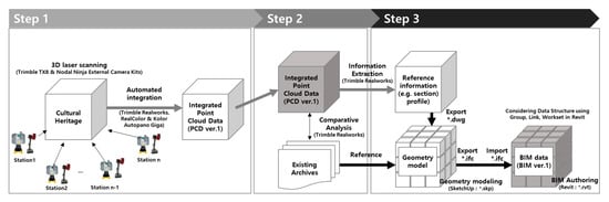 As such, BIM alone has a clear limit in establishing a new methodology for preserving cultural properties. Therefore, many studies have been introduced that combine laser scanning that can accurately measure and investigate cultural heritage and BIM that can manage information. Reinoso-Gordo et al. [22] applied the Scanning process and the photogrammetry process through a case study and proposed the Heritage Building Information Modeling (HBIM) methodology for building maintenance based on the measured data generated through this process. Ham and Lee [23] proposed a process for diagnosing the structural safety of large-scale infrastructure using laser scanning and BIM and analyzed the economic feasibility of the proposed method. In addition, Jung et al. [24] proposed a revamping process for aged steel structures using laser scanning and BIM. The commonality of these previous studies is that the advantages of laser scanning and BIM are used complementarily and can provide an approach for building cultural heritage archives from a long-term and continuous perspective.
