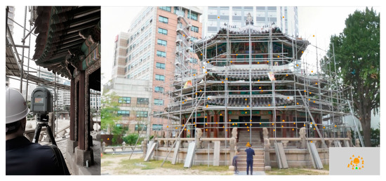 Prior to performing the laser scanning work at the example site, the Jung-gu Office’s permission was obtained. This area is a no-fly zone in downtown Seoul, and drone flying is prohibited for reasons of defense and security. 3D laser scanning for Hwanggungwoo was conducted over two days on 20 and 21 September 2019. Before performing 3D laser scanning, a temporary scaffolding was installed in Hwanggungwoo as shown in Figure 4 due to the restoration and maintenance work of the Hwangudan.