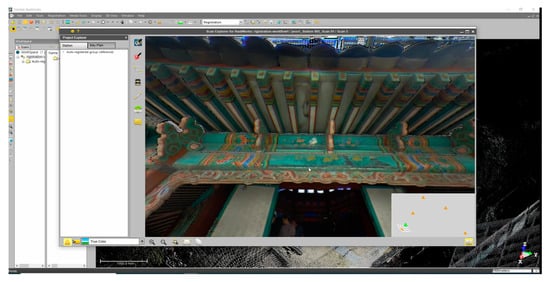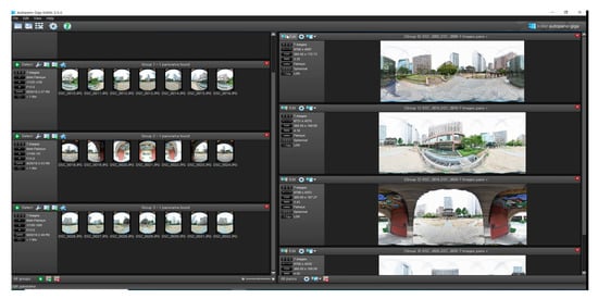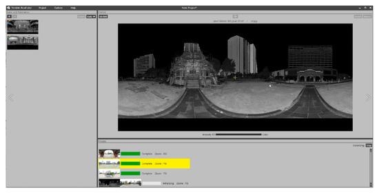 Point cloud data (PCD) measured at multiple locations were integrated through Trimble Realworks. Trimble Realworks have function for point cloud processing and analysis. Especially, this software provides automated tools for point cloud cleanup. The registration process to obtain one PCD is as follows. First, PCD obtained through scanning and images taken with fisheye lenses are acquired. Import PCDs (e.g., *.fls) previously acquired in Trimble Realworks. After importing PCD files and saving the project work data (e.g., *.rwp), the registration work can be managed through this file. Images taken with a fisheye lens are organized through panorama software and converted into picture files (Figure 6). Figure 7 and Figure 8 show the process of attaching images to PCD through Trimble RealColor and the result of matching images to PCD in Trimble Realworks, respectively.