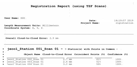 To integrate individual PCDs, the auto-register using planes function of Realworks software was used. Integrated PCD files should be converted to TZF files (e.g., *.e57). After the registration, only the main building was extracted, and noise was removed. The error can be checked by generating a registration report (e.g., *.rtf) using TZF scans. The registration error of nine stations of this case project was confirmed as 2.9 mm as shown in Figure 9. It took more than 10 registration operations to match PCDs shot at a total of 90 stations.