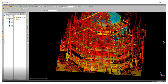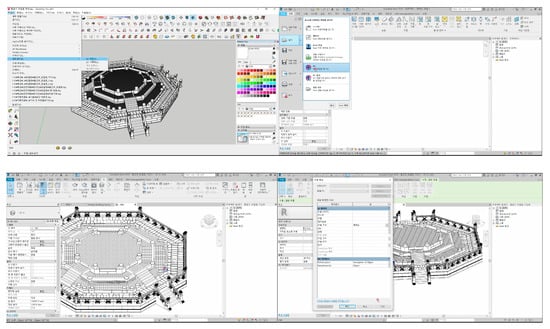 The second method is to automatically convert data acquired through laser scanning to BIM (e.g., scan to BIM) [49,50]. This method requires high-end software (e.g., Trimble Realworks) that can operate a large amount of scan data because it is necessary to integrate PCDs from multiple stations acquired through laser scanning. In order to improve the efficiency for building BIM data, it is necessary to post-process a large amount of scan data. In addition, a software that provides a function to automatically create a BIM object by referring to the post-processed integrated PCD is required. In the case of Korea, the function of automatically generating objects based on scan data is not useful because most of the cultural heritages built are irregular-shaped. In the case of cultural heritages built with a combination of various members, the hierarchy of BIM objects should be reflected in BIM data, but it is difficult to construct systematic BIM data in this way.