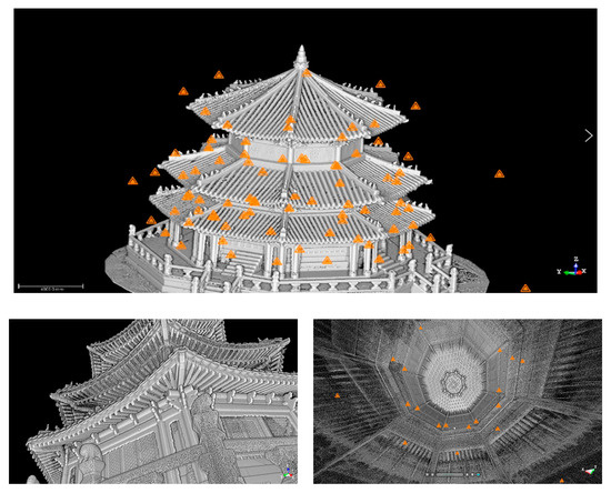 When performing the existing 3D laser scanning operation, it was effective for post-processing that there were no interference elements other than the scan target. However, with the development of PCD processing software (e.g., Trimble Realworks), it is faster than before to remove points with the same material value at once. The temporary scaffolding installed at this site supported 3D laser scanning work. It was possible to scan the outside of Hwanggungwoo not only at the ground level, but also at various levels with temporary scaffolding installed. In Figure 5, the yellow triangles represent the 3D laser scanning location. This point is called a station, and it takes about 3 min per station, including 2 min for laser scanning and 1 min for image acquisition using a fisheye lens camera. Scanning data and image data for Hwanggungwoo were acquired from 90 stations outside and inside for 2 days. Trimble TX8 was used for 3D laser scanning in this case study. Trimble TX8 is a high-performance 3D laser scanner for precise data acquisition, and its basic point cloud acquisition speed is 1 million points/s. Separate high-resolution camera images and point cloud data can be combined and utilized.