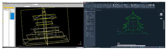 The registered PCD contains all the internal and external shapes of the visible part. Based on this PCD, the quality of archives recorded in the previous Hwanggungwoo dismantling and repair report [58] was inspected. To this end, a section (yellow line in Trimble Realworks) for extracting plane and cross-section information was set from the PCD as shown in Figure 13 (left), and a profile (green lines in AutoCAD) for the section was extracted as shown in Figure 13 (right). These profiles not only serve as a standard for inspecting the quality of existing archives but can also be used as a reference for accurately constructing 3D models of shapes.