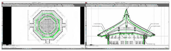In the Hwanggungwoo dismantling and repair report, there is information on the plane, elevation, and section recorded through the actual survey. This information is recorded in CAD format (e.g., *.dwg) and attached as images to the report. In this study, in order to compare and analyze the existing archive and the new archive, the drawing information in image format as shown in Figure 14 and the profile information (green lines) of the plane and section extracted from the PCD were compared. In the case of a plane (left), a difference in shape was found between the information measured in the vertical column (e.g., octagonal column) and the profile extracted from the PCD. In the case of the cross section (right), a difference in shape was found between the information measured in the main horizontal member (e.g., Changbang) and the profile extracted from the PCD. Analysis of these existing archives should precede when constructing a new archive. As such, PCD can be used for quality inspection of existing archives.