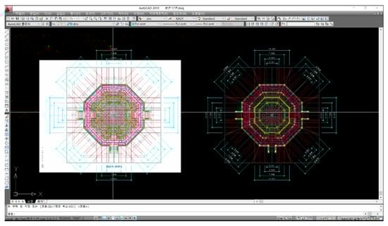 The PCD on the status of cultural heritage does not have perfect symmetry and proportion. In addition, cultural heritage has the potential to undergo shape transformation for a very long time in the future. If such information is reflected in the 3D model as it is, too much effort is put into the modeling work to build the cultural heritage archive. It is very inefficient to construct PCD and BIM data every time for maintenance. For this reason, this study does not aim to perfectly match PCD and BIM data. In this study, in order to construct a 3D model, the part with the least error in shape between the existing archive and PCD was set as the modeling criterion. Figure 15 shows a reference plane for constructing a 3D model of an octagonal Hwanggungwoo through comparative analysis between the existing archive and PCD.