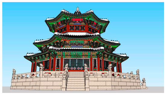 The number of nationally designated cultural assets possessed by Seoul is 164 national treasures, 674 treasures, 67 historic sites, 3 scenic spots, 1 natural monument, 13 intangible cultural properties, and 41 folk cultural properties, for a total of 973. Hwangudan, historical site No. 157, is a place for offering sacrifices to the sky [53]. Currently, Hwanggungwoo and three plaster figures remain on the site of Hwangudan. Hwanggungwoo is a three-story, octagonal building built in 1899, and each plaster figure is carved with a colorful dragon pattern in the shape of a musical instrument. In 2016, a total budget of 320 million won was allocated for the repair work of Hwangudan, including government and local expenses, and restoration and maintenance work in 2019 was also carried out, and flame-retardant work is planned in 2020. For the preservation and management of cultural heritage in which continuous costs are invested, archives that can be used continuously and for a long time are essential. This study aims to conduct a case study on the phased reverse engineering framework for Hwanggungwoo. The image in Figure 3 shows the appearance of Hwanggungwoo at the time of survey. The image on the left of Figure 3 is viewed from the front, and the image on the right shows the shape of the main elements of Hwanggungwoo. In addition, this paper intends to discuss long-term use of archives created through case study.