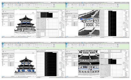 Figure 19 shows the BIM model, which was converted to other parts of Hwanggungwoo. BIM is valuable as an information model depending on whether it can be used as a database. Hwanggungwoo is a built cultural property and contains various elements such as stone materials at the base, members made of wood, windows, and tiles. One type of element, such as a tile, is placed on the first, second, and roof of cultural properties. It is effective in terms of utilization to group elements of the same type and manage them as one information.