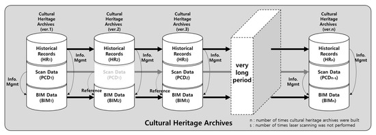 From a long-term perspective, the scenario for building cultural heritage archives is shown in Figure 21. First of all, whenever there is an issue with the maintenance of cultural properties, historical records are accumulated in the form of various documents in cultural heritage archives. The PCD, which is the scan data, does not need to be scanned unless it is destroyed or lost every maintenance. In this case, the previously investigated PCD is referred to. Since BIM data are constructed so that historical records can be entered into the shape, information such as problems and current status photos found in the field survey can be linked with the BIM model. Therefore, BIM data do not change significantly in shape, but various records on cultural properties can be accumulated to provide useful information. Historical records, PCD, and BIM data constituting the cultural heritage archives proposed in this study are independent but can be used complementarily. In addition, by managing the information recorded in the previous survey through BIM data, it is possible to prevent loss of information and reduce the effort involved in re-investigation.