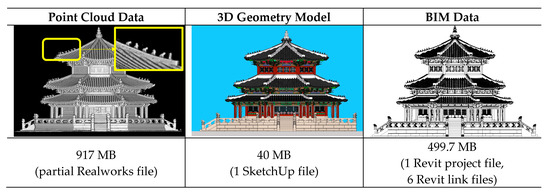 The practical implications of this study are summarized as follows. The first is a method of extracting and utilizing the criteria for geometry modeling from PCD in consideration of the characteristics of cultural properties built in an atypical form. Through this method, high-precision BIM data can be constructed. Second, the file transformation process for managing large amounts of data was presented. The initial 3D model was created based on mass to minimize the capacity, and this model was converted into an information model through the ifc format. Through this, it was possible to compress a lot of large-capacity PCDs. Figure 22 shows the data file size of each software. The size of a part of the PCD file (e.g., Japsang) in a single chunk was 917 MB, whereas 3D geometry model (LOD 200) and BIM data (LOD 300) were analyzed as 40 MB and 499.7 MB, respectively. In the case of a 3D geometry model, it is judged to be at the level of LOD 200 because very accurate shape information referring to PCD is authored. In the case of BIM data, the 3D geometry model data contain only minimal information on cultural properties, so it is judged to be at the level of LOD 300. However, the LOD of BIM data may increase if the information required by the subjects in charge of preserving and managing cultural properties in the future is included. With the development of commercial BIM software and hardware, a very large amount of BIM data can be operated. However, in order to build archives that can be used continuously, BIM data that can be used by defining only necessary information from the perspective of the end user must be built. This can solve the problem of information accessibility of the existing HBIM.