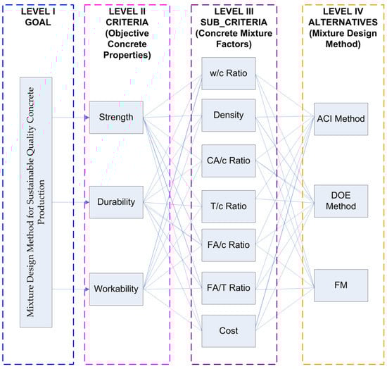 A linear weighting technique, the TOPSIS method was first introduced in the crisp version by Chen and Hwang [], with reference to Hwang and Yoon []. In MCDM, the criteria may be of varying significance and therefore, require different weights []. The weights can be allocated using a range of methods, for example, analytic hierarchy process (AHP), analytic network process (ANP), entropy analysis, eigenvector method, etc. The proposed TOPSIS approach in the fuzzy environment is implemented to the problem of selecting an effective mix design method for the production of quality concrete. Problem formulation defines the goals of the problem, the assessment criteria, the decision-makers, and their classes. The framed problem, consisting of a four-level hierarchy, namely, goal (level 1), criteria (level 2—objective properties for sustainable quality concrete), sub-criteria (level 3—significant mixture parameters for sustainable quality concrete), and alternatives (level 4—popular mixture design methods effective for sustainable quality concrete), is depicted in Figure 2. Three potential concrete mixture design methods for sustainability, the Department of Energy (DOE) method, the American Concrete Institute (ACI) method, and the Fineness Modulus (FM) method, with objective properties such as strength, workability, and durability, etc., required for sustainable quality concrete are considered in the model framework. The seven mixture factors, which include the proposed dominant mix factors for the production of sustainable quality concrete, i.e., environmental and socioeconomic aspects, namely density (environmental criteria), the cost, ratio of water and cement (w/c), ratio of total aggregate and cement (T/c), ratio of coarse aggregate and cement (CA/c), ratio of fine aggregate and cement (FA/c), and ratio of fine aggregate/total aggregate (FA/T) (socioeconomic criteria) are taken into consideration.
