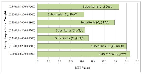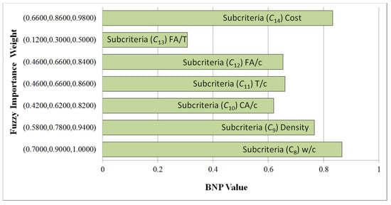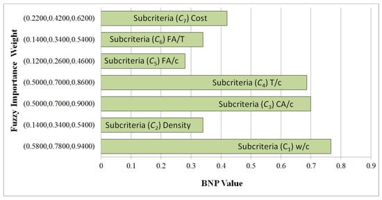 Decision-makers first gave a preference for each criteria or objective properties for sustainable concrete in response to the questionnaire as per Appendix A. For the evaluation criteria, an integrated fuzzy weight matrix was developed by the average value technique mentioned in Equation (12). The Center of Area (COA) method [] was used to de-fuzzify the TFNs into corresponding values of best non-fuzzy output (BNP) to understand the order of importance of these selection criteria. The integrated fuzzy importance weight matrix and BNP values corresponding to each sub-criteria related to different criteria are presented in Table 2, Table 3, Table 4 and Table 5. The BNP values found for the seven sub-criteria for assessing mix design methods for sustainable quality concrete are w/c ratio (0.767), density (0.34), CA/c (0.7), T/c (0.687), FA/c (0.28), FA/T (0.34), and cost (0.42) when workability criteria are considered. The BNP values of seven selected sub-criteria are as w/c ratio (0.867), density (0.767), CA/c (0.62), T/c (0.66), FA/c (0.653), FA/T (0.307), and cost (0.833), and w/c ratio (0. 833), density (0.8), CA/c (0.46), T/c (0.427), FA/c (0.693), FA/T (0.42), and cost (0.733), respectively, with respect to strength and durability considerations. Figure 3, Figure 4 and Figure 5 depict the graphical representation of fuzzy weight assigned to each sub-criterion by decision-makers. Fuzzy weights are obtained after normalizing the BNP values.
