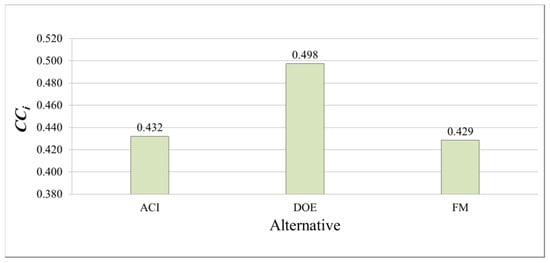 When the distances of the concrete mix design method from FPIRP and FNIRP are calculated, Equation (17) can provide the closeness coefficient. CC can be obtained for the concrete mix design methods’ alternatives from the obtained distances of the concrete mix design methods from FPIRP and FNIRP. Table 9 shows the distances of the concrete mix design method from FPIRP and FNIRP, the CC, and selection order of different concrete mix design methods’ alternatives. The potentiality order of various concrete mixture design methods’ alternatives is shown in Figure 6.