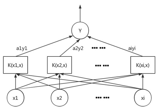 The structure of an SVM can be divided into the input layer, intermediate node layer, and output layer. A general structure of an SVM is shown in Figure 1. By introducing an insensitive loss function and corresponding kernel functions, an SVM can be extended and applied to regression estimation problems, that is, SVR [38].