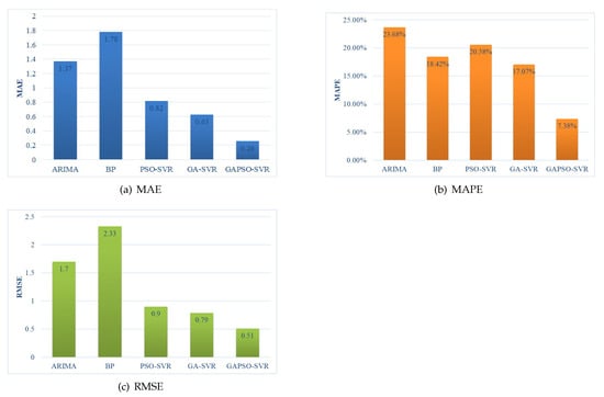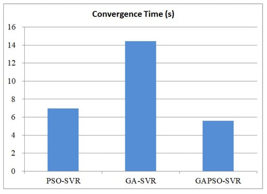 The baseline methods we chose to compare with our method were ARIMA (Auto Regessive Integrated Moving Average), BP (Back-Propagation) Neural Network (BP), PSO-optimized SVR (PSO-SVR), and GA-optimized SVR (GA-SVR). Our method is denoted as GAPSO-SVR. The comparison results of different methods are shown in Figure 4. The comparison results of the convergence times for the three kinds of SVR-based methods are shown in Figure 5. According to those comparisons, we could conclude that, among all three SVR-based methods, the GAPSO-SVR could generate the best prediction results while maintaining the lowest necessary convergence time.