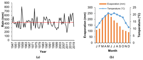 Climatic Parameters of the Leobardo Reynoso Irrigation Module. (a) Rain Series for 65 Years, (b) Evaporation and Temperature Annual Averages in the Region.