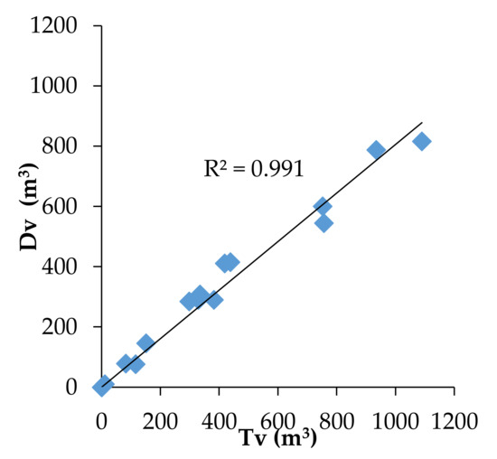The evolution of the water conduction efficiency of the main system (Vs/Vt) under the concept of modular flow in the 2013 season presented high values between 66% and 95%. The 66% conduction efficiency of the irrigation event on 11 April 2020 was due to the channels and pipes filling. Figure 6 shows a highly significant correlation between the total volume available and the delivered volume (R2 = 0.98, p < 0.001). Taking into account the total volume extracted (6067.13 m3/ha) and the volume delivered (5058.74 m3/ha), the global efficiency was 83%, highlighting that 2013 was not a regular year. If we compare this 83% with the estimated by the theoretical volume before the modernization (global efficiency of 60%), there was an increase of 23% in the system general efficiency. This value represents an excellent performance of the system in accordance with different countries, such as Spain, China, USA, and Italy, among others, where the conduction and distribution network has been modernized, reporting significant increases in the performance efficiencies of the hydro-agricultural system [30,34] similar to those found in this research.