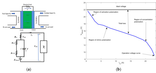 A Fuel Cell (FC) is an electrical and chemical system that transforms chemical energy generally from hydrogen directly to electric power. The analogous electrical circuit may be used to simulate the complex behaviors of the FC and its polarization curves are depicted in Figure 1a,b, respectively [52]. This model is characterized by a sequence of equations and a set of parameters, the interpretation of which is crucial for successful simulation performance. The polarization is caused by chemical and physical factors associated with various elements in the fuel cell, such as temperature, pressure, and gas composition. The three primary types of polarization, named activation, ohmic (or resistance) and concentration, are illustrated in Figure 1b.