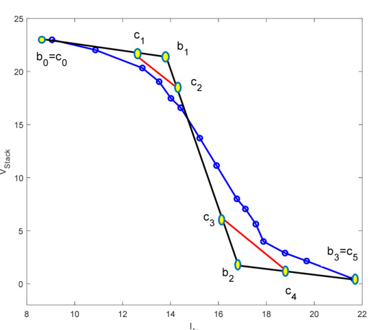 Figure 2 illustrates the degree elevation of a cubic Bézier piece with b0 and b4 are the content and ending points, respectively, and the points c1,…,c5 are the connecting or midpoint points. The points from b2,…,b2 are the control points of the curve. The curve constructed by the control points is called control polygon. The subdivision of the FC characteristic voltage–current curve using the Bézier curve method is illustrated in Figure 2.