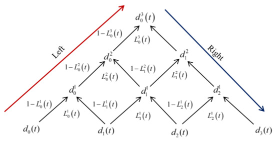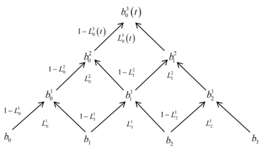 The points are obtained by the de Casteljau algorithm, which provides not only a procedural approach to the subdivision, but also an attractive graphical representation of the points . Figure 3 and Figure 4 illustrate the diagram of the de Casteljau algorithm applied to the control points of the Bézier curve for n = 3 and the relationship between and , respectively.