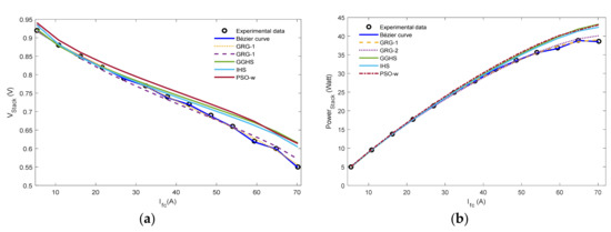 To present more validity and accuracy of the proposed method, the reconstructions of the V–I and P–I are presented in Figure 5a,b. The reconstructed approximated characteristics curves are compared with the experimental data point and GRG-1, GRG-2, GGHS, IHS, and PSO-w. The results of validation and approximation curves denote an excellent match compared with empirical data and other algorithms. From Figure 5, it is shown that the two algorithms GRG-1 and GRG-2 are close to experimental data in low voltage while in high voltage, they are far. The other algorithm approximated the two curves by high errors in high and low voltages.